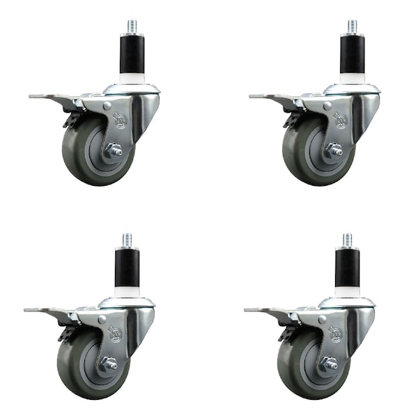 3'' SS Gray Poly Swivel 1-3/8'' Expanding Stem Caster Set Total Lock Brake, 4PK