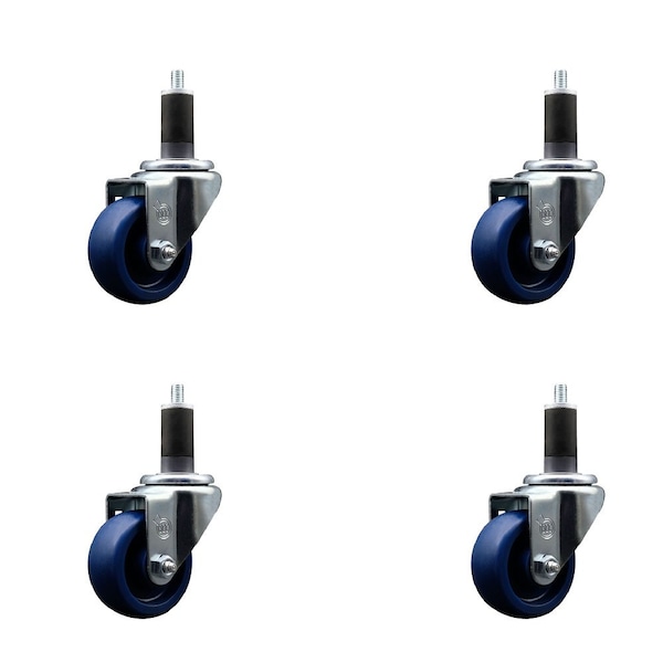 Listing is for a set of four 4 Service Caster Series #20 1-1/4'' expanding stem stainless steel swivel casters with 3'' diameter by 1-1/4'' wide blue solid polyurethane wheels capable of supporting a total weight of 1,200 lbs. 300 lbs./caster.. When searching for a reliable and durable solution to your caster needs, look no further than the Service Caster Series 20 expanding stem solid polyurethane wheel casters. The Series #20 features an innovative expanding stem that can easily adapt to the inside diameter of the opening, allowing for a secure fit in round or square tubes. Simply tighten the topmost knurled nut to compress the rubber for a snug fit. For added security, further compress the rubber with a wrench via the nut under the swivel raceway. Finely crafted with a bright zinc plated finish, heat-treated ball bearing raceway, and a solid polyurethane wheel, this versatile caster is ideal for work tables, shop projects, or any equipment with round or square tube legs. Service Caster is unsurpassed in quality, reliability, and excellent customer service. Count on us to move you forward.