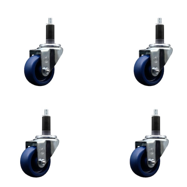 Listing is for a set of four 4 Service Caster Series #20 1-1/8'' expanding stem stainless steel swivel casters with 3'' diameter by 1-1/4'' wide blue solid polyurethane wheels capable of supporting a total weight of 1,200 lbs. 300 lbs./caster.. When searching for a reliable and durable solution to your caster needs, look no further than the Service Caster Series 20 expanding stem solid polyurethane wheel casters. The Series #20 features an innovative expanding stem that can easily adapt to the inside diameter of the opening, allowing for a secure fit in round or square tubes. Simply tighten the topmost knurled nut to compress the rubber for a snug fit. For added security, further compress the rubber with a wrench via the nut under the swivel raceway. Finely crafted with a bright zinc plated finish, heat-treated ball bearing raceway, and a solid polyurethane wheel, this versatile caster is ideal for work tables, shop projects, or any equipment with round or square tube legs. Service Caster is unsurpassed in quality, reliability, and excellent customer service. Count on us to move you forward.
