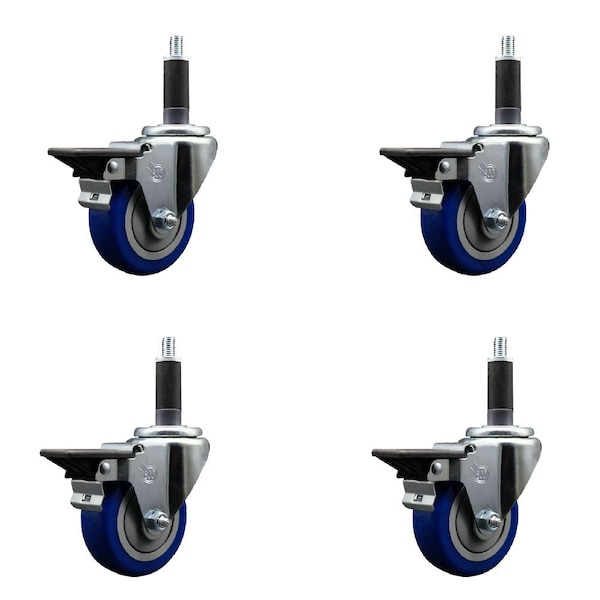 3.5'' Blue Poly Swivel 1'' Expanding Stem Caster Set with Brake, 4PK