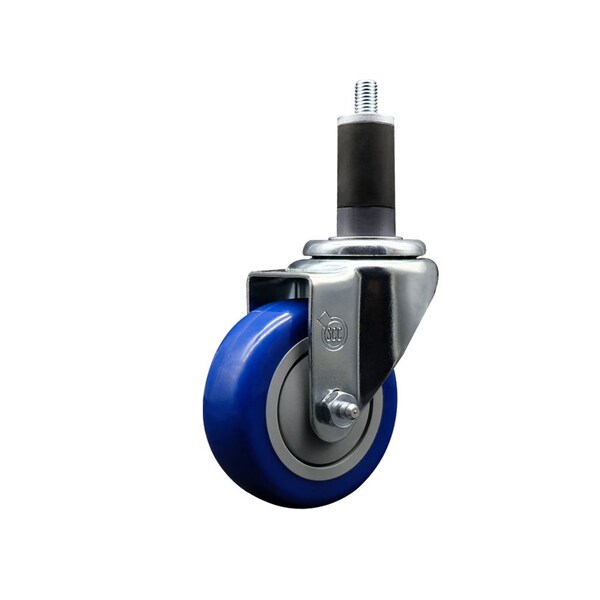 Listing is for one 1 Service Caster Series #20 1-1/4'' expanding stem swivel caster with a 3-1/2'' diameter by 1-1/4'' wide blue polyurethane wheel capable of supporting 300 lbs./caster. When searching for a reliable and durable solution to your caster needs, look no further than the Service Caster Series 20 expanding stem blue polyurethane wheel casters. The Series #20 features an innovative expanding stem that can easily adapt to the inside diameter of the opening, allowing for a secure fit in round or square tubes. Simply tighten the topmost knurled nut to compress the rubber for a snug fit. For added security, further compress the rubber with a wrench via the nut under the swivel raceway. Finely crafted with a bright zinc plated finish, heat-treated ball bearing raceway, and a blue polyurethane wheel, this versatile caster is ideal for work tables, shop projects, or any equipment with round or square tube legs. Service Caster is unsurpassed in quality, reliability, and excellent customer service. Count on us to move you forward.