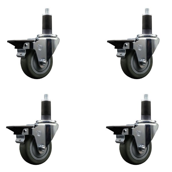 3.5'' Gray Poly Swivel 1-1/4'' Expanding Stem Caster Set with Brake, 4PK
