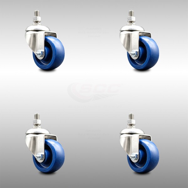 3.5 Inch 316SS Solid Polyurethane Wheel Swivel 12mm Threaded Stem Caster Set