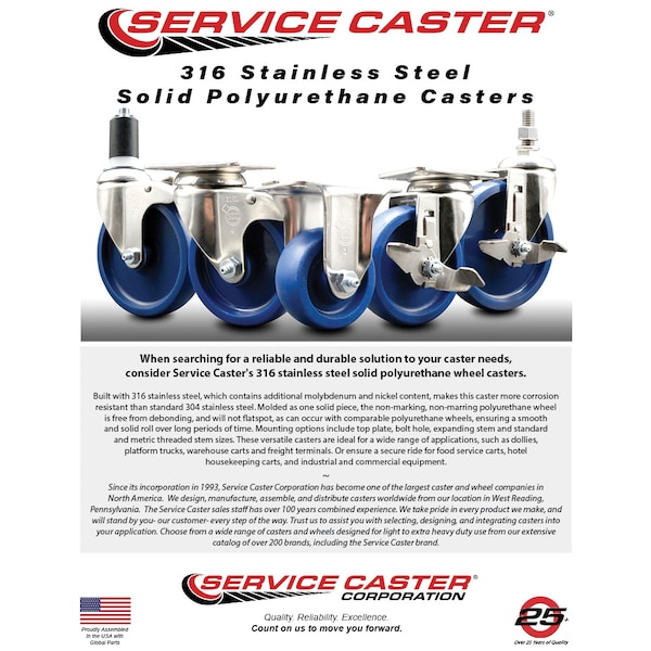 Listing is for one (1) Service Caster Series #20 316 stainless steel swivel caster with a 3.5" diameter by 1-1/4" wide blue solid polyurethane wheel capable of supporting 300lbs./caster. When searching for a reliable and durable solution to your caster needs, consider Service Caster's 316 stainless steel solid polyurethane wheel casters. Built with 316 stainless steel, which contains additional molybdenum and nickel content, makes this caster more corrosion resistant than standard 304 stainless steel. Molded as one solid piece, the non-marking, non-marring polyurethane wheel is free from debonding, and will not flatspot, as can occur with comparable polyurethane wheels, ensuring a smooth and solid roll over long periods of time. Mounting options include top plate, bolt hole, expanding stem and standard and metric threaded stem sizes. These versatile casters are ideal for a wide range of applications, such as dollies, platform trucks, warehouse carts and freight terminals. Or ensure a secure ride for food service carts, hotel housekeeping carts, and industrial and commercial equipment.