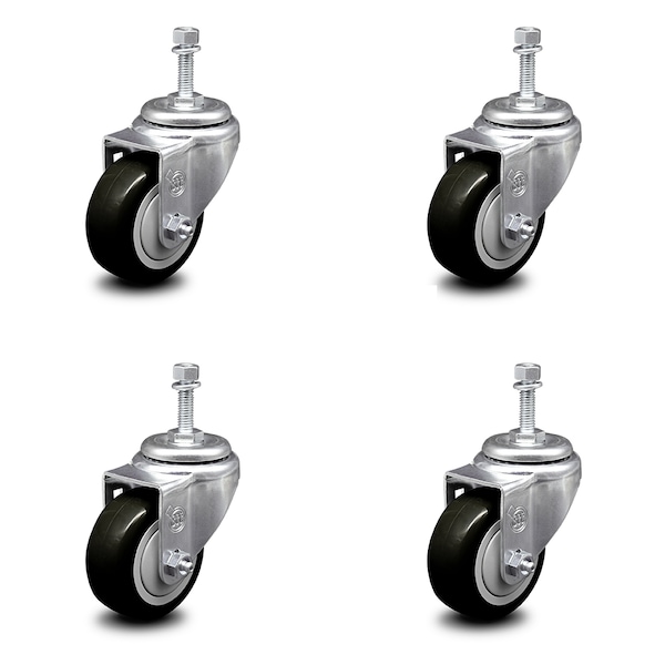 3.5 Inch Black Polyurethane Wheel Swivel 10mm Threaded Stem Caster Set SCC