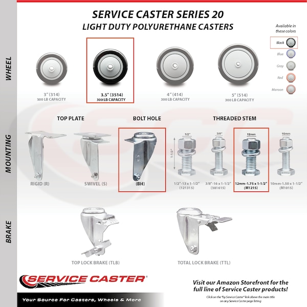 Listing is for one (1) Service Caster Series #20 swivel caster with a 3-1/2" diameter by 1-1/4" wide black polyurethane wheel and a 12mm metric threaded stem capable of supporting 250 lbs./caster.When searching for a reliable and durable solution to your caster needs, consider Service Caster’s Series 20 threaded stem polyurethane casters. The Service Caster Series #20 is ideal for light and medium duty material handling, carts, equipment, and shop projects. The bolt hole can accept a bolt or a customized stem, allowing for any type of mounting requirement. The zinc plated finish provides durability under any condition, while the non-marking, non-marring polyurethane wheels perform especially well on hard surfaces such as concrete, tile, and wood. All rolling on a finely crafted ball bearing design that will keep you moving forward. Service Caster is unsurpassed in quality, reliability, and excellent customer service. Count on us to move you forward.