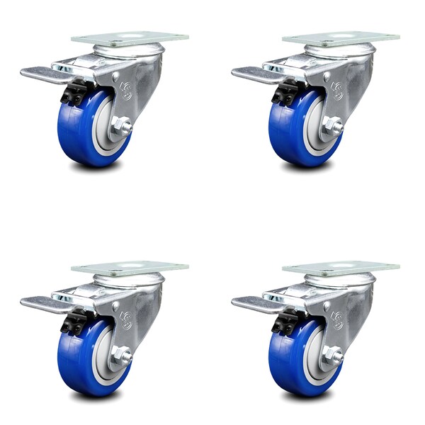 3.5 Inch Blue Polyurethane Swivel Top Plate Caster Set with Total Lock Brake