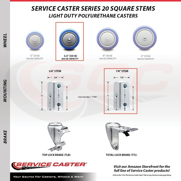 Listing is for one (1) Service Caster Series #20 swivel caster with a 3-1/2” diameter by 1-1/4” wide blue polyurethane wheel and a 7/8" square stem capable of supporting 250lbs./caster. When searching for a reliable and durable solution to your caster needs, consider Service Caster’s Series 20 square stem polyurethane casters.The Service Caster Series 20 is ideal for light and medium duty material handling, carts, equipment, and shop projects. The zinc plated finish provides durability under any condition, while the non-marking, non-marring polyurethane wheels perform especially well on hard surfaces such as concrete, tile, and wood. The square stems are designed to be bolted or riveted onto the inside of angled iron legs or against any flat surface. All rolling on a finely crafted ball bearing design that keeps you moving forward.
