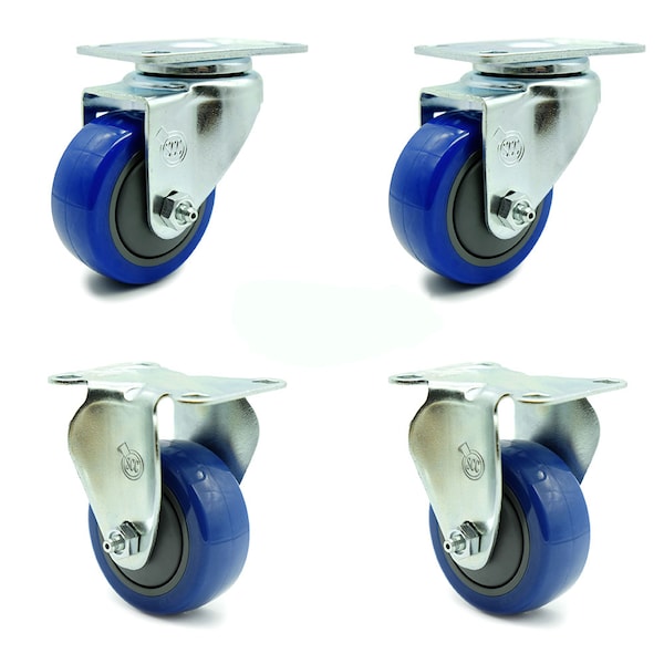 3.5 Inch Blue Polyurethane Wheel Swivel Top Plate Caster Set with 2 Rigid SCC