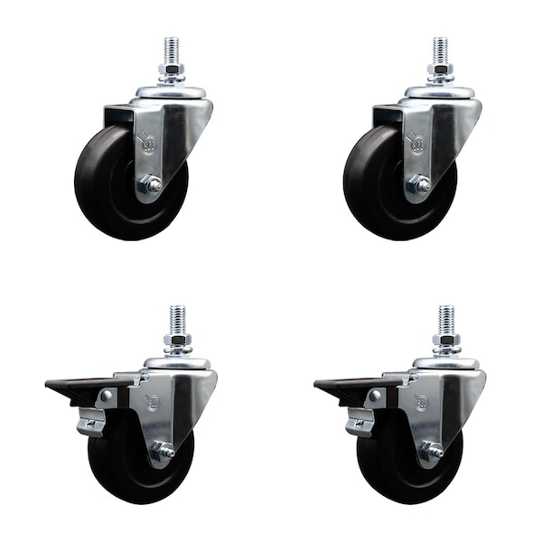 Listing is for a set of four 4 Service Caster Series 20 casters, two 2 swivel 10MM threaded stem with brake casters and two 2 swivel casters, with 312 diameter by 114 wide hard rubber wheels Supports a total weight of 1,140lbs 285lbsper caster When searching for a reliable and durable solution to your caster needs, consider Service Casters Series 20 hard rubber casters The Service Caster Series 20 is ideal for light and medium duty material handling, carts, equipment, and shop projects The hard rubber wheels not only provide higher load capacities and impact resistance than comparable wheels, but are also resistant to most chemicals and oils Mounting options include top plate, bolt hole and standard and metric threaded stem sizes All rolling on a finely crafted ball bearing design and zinc plated finish that provides durability under any condition and keeps you safely moving forward