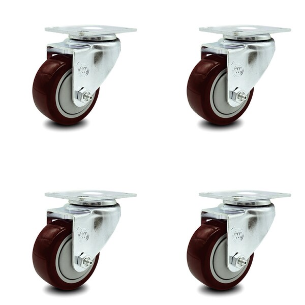 3.5 Inch Maroon Polyurethane Wheel Swivel Top Plate Caster Set