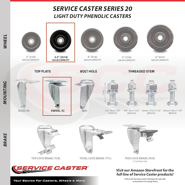 Listing is for a set of four (4) Service Caster Series #20 swivel casters, four (4) swivel casters with 3.5” diameter by 1-1/4” wide phenolic wheels. Supports a total weight of 1,200lbs (300lbs/per caster). When searching for a reliable and durable solution to your caster needs, consider Service Caster’s Series 20 phenolic casters. The Service Caster Series #20 is ideal for light and medium duty material handling, carts, equipment, and shop projects. The phenolic wheels have a high resistance to impact damage while providing protection for floors in commercial and industrial settings. Phenolic wheels not only provide higher load capacities and impact resistance than comparable wheels, but are also resistant to most chemicals and oils. Mounting options include top plate, bolt hole and standard and metric threaded stem sizes. All rolling on a finely crafted ball bearing design and zinc plated finish that provides durability under any condition and keeps you safely moving forward. Service Caster is unsurpassed in quality, reliability, and excellent customer service. Count on us to move you forward.