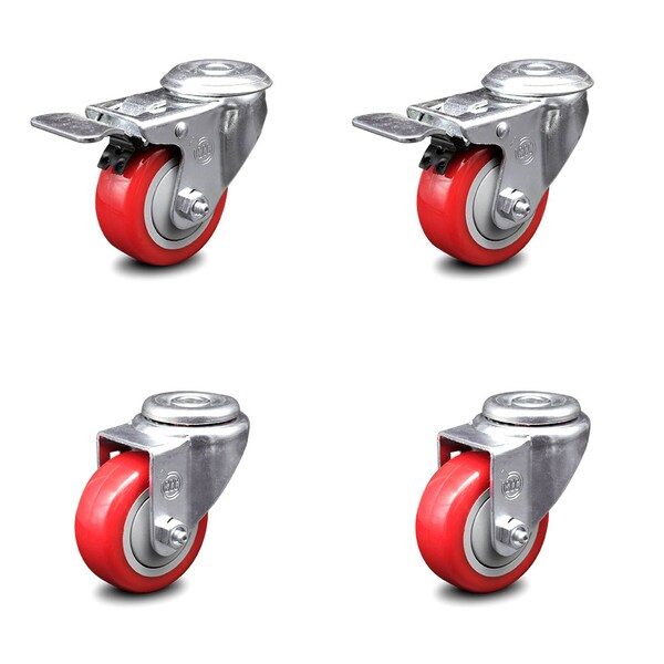 Listing is for a set of four (4) Service Caster Series #20 casters, two (2) swivel bolt hole casters and two (2) swivel casters, with 3-1/2” diameter by 1-1/4” wide red polyurethane wheels. Supports a total weight of 1,000lbs (250lbs/per caster).When searching for a reliable and durable solution to your caster needs, consider Service Caster’s Series 20 bolt hole polyurethane casters. The Service Caster Series #20 is ideal for light and medium duty material handling, carts, equipment, and shop projects. The bolt hole can accept a bolt or a customized stem, allowing for any type of mounting requirement. The zinc plated finish provides durability under any condition, while the non-marking, non-marring polyurethane wheels perform especially well on hard surfaces such as concrete, tile, and wood. All rolling on a finely crafted ball bearing design that will keep you moving forward. Service Caster is unsurpassed in quality, reliability, and excellent customer service. Count on us to move you forward.