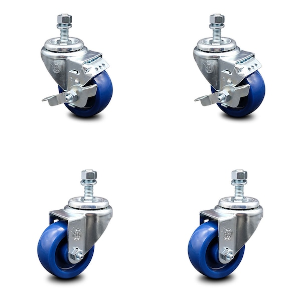 Listing is for a set of four (4) Service Caster Series #20 casters, two (2) swivel 1/2" threaded stem with brake casters and two (2) swivel casters, with 3-1/2” diameter by 1-1/4” wide solid polyurethane wheels. Supports a total weight of 1,200lbs (300lbs/per caster).The Service Caster Series #20 is ideal for light and medium duty material handling, carts, equipment, and shop projects. The zinc plated finish provides durability under any condition. And the non-marking, non-marring polyurethane wheel is molded as one solid piece, making it free from debonding. This ensures the wheel will not flat spot, as can occur with comparable polyurethane wheels, resulting in a smooth and solid roll over long periods of time. Mounting options include top plate, bolt hole and standard and metric threaded stem sizes. Service Caster is unsurpassed in quality, reliability, and excellent customer service. Count on us to move you forward.