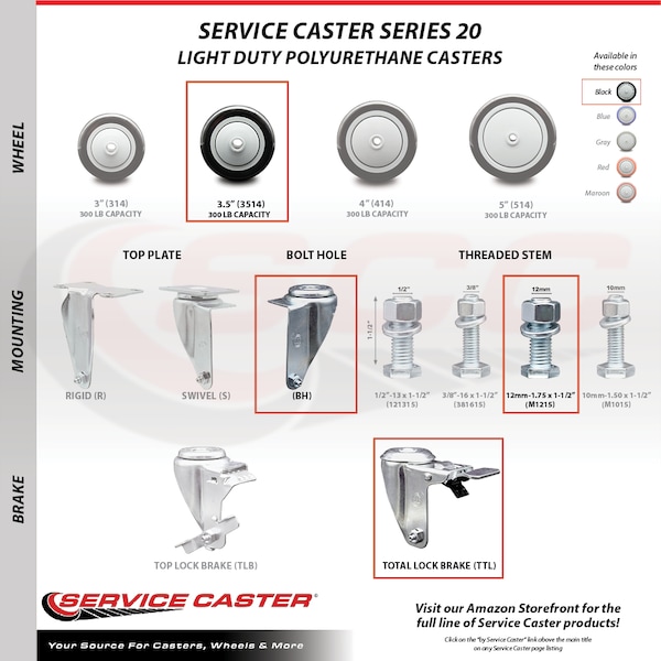 Listing is for one (1) Service Caster Series #20 stainless steel swivel caster with a 3-1/2" diameter by 1-1/4" wide Black polyurethane wheel and a 12mm-1.75 X 1-1/2" metric threaded stem with a total lock brake capable of supporting 250 lbs./caster.When searching for a reliable and durable solution to your caster needs, consider Service Caster’s Series 20 stainless steel threaded stem polyurethane casters. The Service Caster Series #20 is ideal for light and medium duty material handling, carts, equipment, and shop projects. The threaded stem is available in standard or metric sizes and ensures a solid and secure attachment. The polished stainless steel finish provides durability under any condition, while the non-marking, non-marring polyurethane wheels perform especially well on hard surfaces such as concrete, tile, and wood. All rolling via a finely crafted ball bearing design that will keep you moving forward. Service Caster is unsurpassed in quality, reliability, and excellent customer service. Count on us to move you forward.