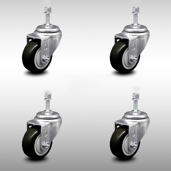 3.5 Inch SS Black Polyurethane Wheel Swivel 10mm Threaded Stem Caster Set