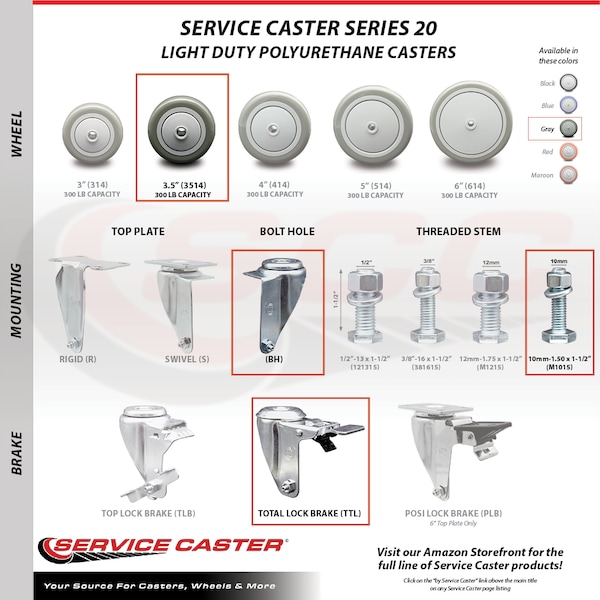 Listing is for a set of four (4) Service Caster Series #20 stainless steel casters, two (2) swivel 10mm-1.50 X 1-1/2" metric threaded stem with total lock brake casters and two (2) swivel casters, with 3-1/2” diameter by 1-1/4” wide gray polyurethane wheels. Supports a total weight of 1,000lbs (250lbs/per caster).When searching for a reliable and durable solution to your caster needs, consider Service Caster’s Series 20 stainless steel threaded stem polyurethane casters. The Service Caster Series #20 is ideal for light and medium duty material handling, carts, equipment, and shop projects. The threaded stem is available in standard or metric sizes and ensures a solid and secure attachment. The polished stainless steel finish provides durability under any condition, while the non-marking, non-marring polyurethane wheels perform especially well on hard surfaces such as concrete, tile, and wood. All rolling via a finely crafted ball bearing design that will keep you moving forward. Service Caster is unsurpassed in quality, reliability, and excellent customer service. Count on us to move you forward.