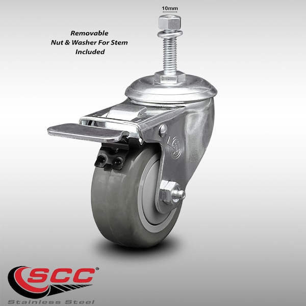3.5 Inch SS Gray Polyurethane 10mm Threaded Stem Caster Total Lock Brake SCC