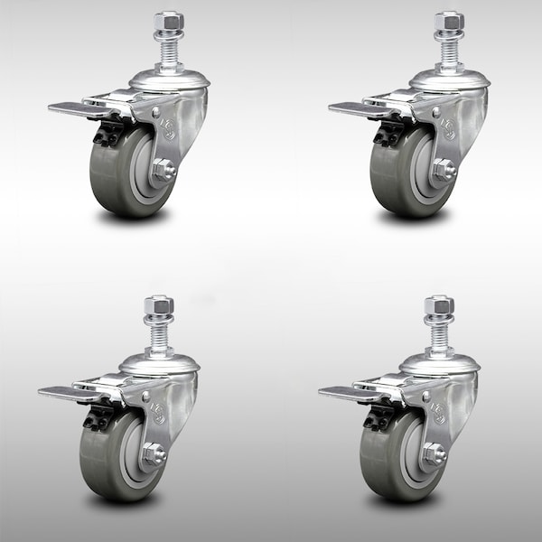 3.5 Inch SS Gray Polyurethane 12mm Threaded Stem Caster Set Total Lock Brake