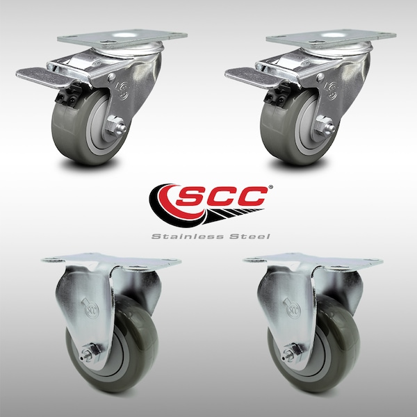 3.5 Inch SS Gray Polyurethane Top Plate Caster Lock Brake 2 Rigid SCC, 2PK