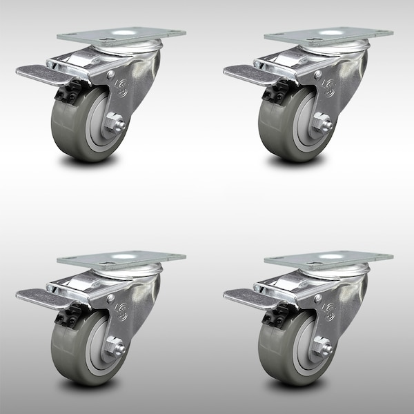 3.5 Inch SS Gray Polyurethane Top Plate Caster Set Total Lock Brake SCC