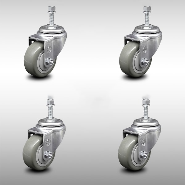 3.5 Inch SS Gray Polyurethane Wheel Swivel 10mm Threaded Stem Caster Set SCC