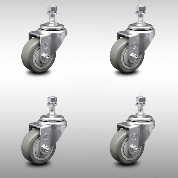 3.5 Inch SS Gray Polyurethane Wheel Swivel 12mm Threaded Stem Caster Set SCC