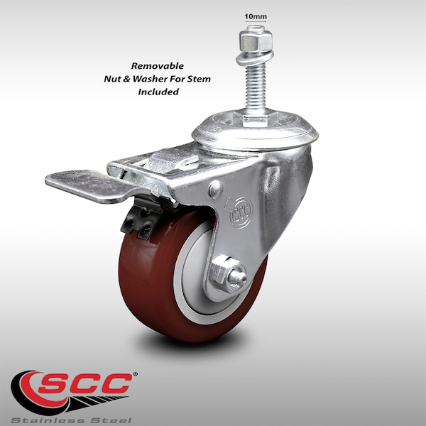 Listing is for one (1) Service Caster Series #20 stainless steel swivel caster with a 3-1/2" diameter by 1-1/4" wide maroon polyurethane wheel and a 10mm-1.50 X 1-1/2" metric threaded stem with a total lock brake capable of supporting 250 lbs./caster.When searching for a reliable and durable solution to your caster needs, consider Service Caster’s Series 20 stainless steel threaded stem polyurethane casters. The Service Caster Series #20 is ideal for light and medium duty material handling, carts, equipment, and shop projects. The threaded stem is available in standard or metric sizes and ensures a solid and secure attachment. The polished stainless steel finish provides durability under any condition, while the non-marking, non-marring polyurethane wheels perform especially well on hard surfaces such as concrete, tile, and wood. All rolling via a finely crafted ball bearing design that will keep you moving forward. Service Caster is unsurpassed in quality, reliability, and excellent customer service. Count on us to move you forward.