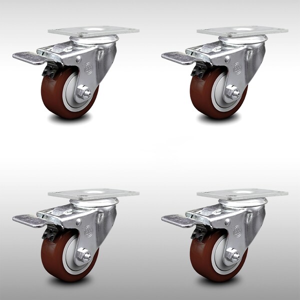 3.5 Inch SS Maroon Polyurethane Top Plate Caster Set Total Lock Brake SCC