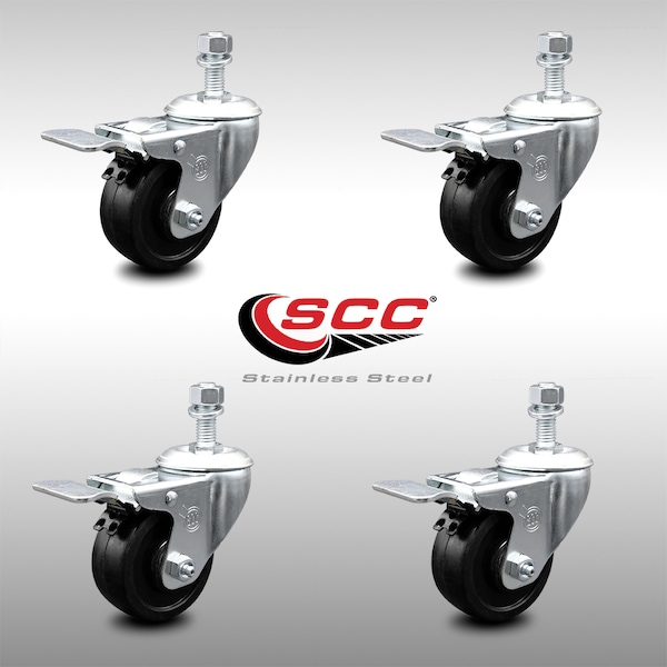 3.5 Inch SS Soft Rubber 12mm Threaded Stem Caster Set Total Lock Brake SCC