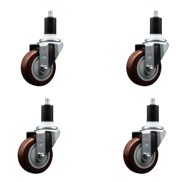 Listing is for a set of four 4 Service Caster Series #20 1-1/2'' expanding stem swivel casters with 3-1/2'' diameter by 1-1/4'' wide maroon polyurethane wheels capable of supporting a total weight of 1,200 lbs. 300 lbs./caster.. When searching for a reliable and durable solution to your caster needs, look no further than the Service Caster Series 20 expanding stem maroon polyurethane wheel casters. The Series #20 features an innovative expanding stem that can easily adapt to the inside diameter of the opening, allowing for a secure fit in round or square tubes. Simply tighten the topmost knurled nut to compress the rubber for a snug fit. For added security, further compress the rubber with a wrench via the nut under the swivel raceway. Finely crafted with a bright zinc plated finish, heat-treated ball bearing raceway, and a maroon polyurethane wheel, this versatile caster is ideal for work tables, shop projects, or any equipment with round or square tube legs. Service Caster is unsurpassed in quality, reliability, and excellent customer service. Count on us to move you forward.
