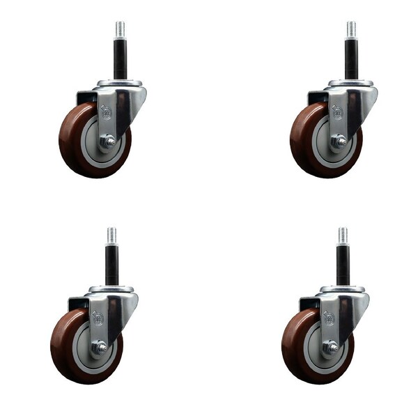Listing is for a set of four 4 Service Caster Series #20 1-3/4'' expanding stem swivel casters with 3-1/2'' diameter by 1-1/4'' wide maroon polyurethane wheels capable of supporting a total weight of 1,200 lbs. 300 lbs./caster.. When searching for a reliable and durable solution to your caster needs, look no further than the Service Caster Series 20 expanding stem maroon polyurethane wheel casters. The Series #20 features an innovative expanding stem that can easily adapt to the inside diameter of the opening, allowing for a secure fit in round or square tubes. Simply tighten the topmost knurled nut to compress the rubber for a snug fit. For added security, further compress the rubber with a wrench via the nut under the swivel raceway. Finely crafted with a bright zinc plated finish, heat-treated ball bearing raceway, and a maroon polyurethane wheel, this versatile caster is ideal for work tables, shop projects, or any equipment with round or square tube legs. Service Caster is unsurpassed in quality, reliability, and excellent customer service. Count on us to move you forward.