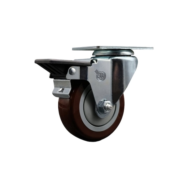 Listing is for one 1 Service Caster Series #20 swivel caster with a 3-1/2'' diameter by 1-1/4'' wide maroon polyurethane wheel and a posi locking brake capable of supporting 300 lbs./caster. When searching for a reliable and durable solution to your caster needs, look no further than the Service Caster Series 20 top plate polyurethane casters. The Service Caster Series #20 is ideal for light and medium duty material handling, carts, equipment, and shop projects. The zinc plated finish provides durability under any condition, while the non-marking, non-marring polyurethane wheels perform especially well on hard surfaces such as concrete, tile, and wood- rolling on a finely crafted ball bearing design that keeps you moving forward. Service Caster is unsurpassed in quality, reliability, and excellent customer service. Count on us to move you forward.