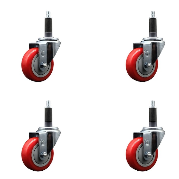 3.5'' Red Poly Wheel Swivel 1'' Expanding Stem Caster Set, 4PK