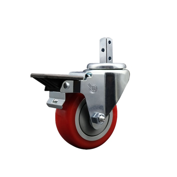 Listing is for one 1 Service Caster Series #20 swivel caster with a 3-1/2'' diameter by 1-1/4'' wide red polyurethane wheel and a 3/4'' square stem with posi lock brake capable of supporting 300lbs./caster. When searching for a reliable and durable solution to your caster needs, consider Service Caster's Series 20 square stem polyurethane casters.The Service Caster Series 20 is ideal for light and medium duty material handling, carts, equipment, and shop projects. The zinc plated finish provides durability under any condition, while the non-marking, non-marring polyurethane wheels perform especially well on hard surfaces such as concrete, tile, and wood. The square stems are designed to be bolted or riveted onto the inside of angled iron legs or against any flat surface. All rolling on a finely crafted ball bearing design that keeps you moving forward.