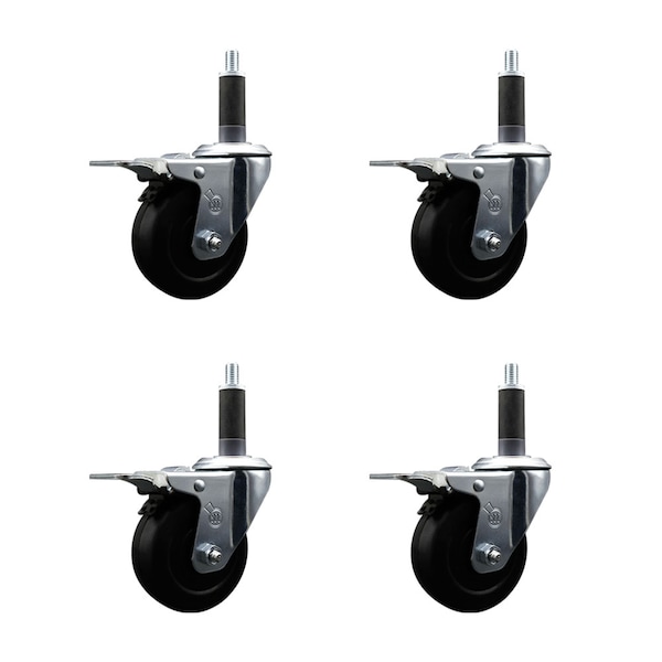 Listing is for a set of four 4 Service Caster Series #20 1'' expanding stem swivel casters with 3-1/2'' diameter by 1-1/4'' wide black soft rubber wheels and total locking brakes capable of supporting a total weight of 800 lbs. 200 lbs./caster.. When searching for a reliable and durable solution to your caster needs, look no further than the Service Caster Series 20 expanding stem soft rubber wheel casters. The Series #20 features an innovative expanding stem that can easily adapt to the inside diameter of the opening, allowing for a secure fit in round or square tubes. Simply tighten the topmost knurled nut to compress the rubber for a snug fit. For added security, further compress the rubber with a wrench via the nut under the swivel raceway. Finely crafted with a bright zinc plated finish, heat-treated ball bearing raceway, and a soft rubber wheel, this versatile caster is ideal for work tables, shop projects, or any equipment with round or square tube legs. Service Caster is unsurpassed in quality, reliability, and excellent customer service. Count on us to move you forward.