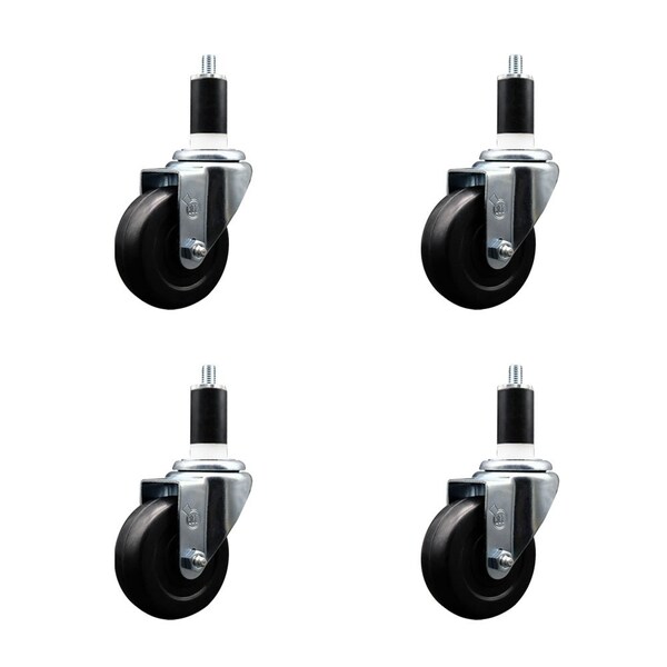Listing is for a set of four 4 Service Caster Series #20 1-3/8'' expanding stem swivel casters with 3-1/2'' diameter by 1-1/4'' wide black soft rubber wheels capable of supporting a total weight of 800 lbs. 200 lbs./caster.. When searching for a reliable and durable solution to your caster needs, look no further than the Service Caster Series 20 expanding stem soft rubber wheel casters. The Series #20 features an innovative expanding stem that can easily adapt to the inside diameter of the opening, allowing for a secure fit in round or square tubes. Simply tighten the topmost knurled nut to compress the rubber for a snug fit. For added security, further compress the rubber with a wrench via the nut under the swivel raceway. Finely crafted with a bright zinc plated finish, heat-treated ball bearing raceway, and a soft rubber wheel, this versatile caster is ideal for work tables, shop projects, or any equipment with round or square tube legs. Service Caster is unsurpassed in quality, reliability, and excellent customer service. Count on us to move you forward.