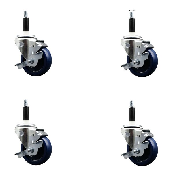 Listing is for a set of four 4 Service Caster Series #20 7/8'' expanding stem swivel casters with 3-1/2'' diameter by 1-1/4'' wide blue solid polyurethane wheels and top locking brakes capable of supporting a total weight of 1,200 lbs. 300 lbs./caster.. When searching for a reliable and durable solution to your caster needs, look no further than the Service Caster Series 20 expanding stem solid polyurethane wheel casters. The Series #20 features an innovative expanding stem that can easily adapt to the inside diameter of the opening, allowing for a secure fit in round or square tubes. Simply tighten the topmost knurled nut to compress the rubber for a snug fit. For added security, further compress the rubber with a wrench via the nut under the swivel raceway. Finely crafted with a bright zinc plated finish, heat-treated ball bearing raceway, and a solid polyurethane wheel, this versatile caster is ideal for work tables, shop projects, or any equipment with round or square tube legs. Service Caster is unsurpassed in quality, reliability, and excellent customer service. Count on us to move you forward.