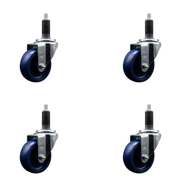 Listing is for a set of four 4 Service Caster Series #20 1-1/8'' expanding stem swivel casters with 3-1/2'' diameter by 1-1/4'' wide blue solid polyurethane wheels capable of supporting a total weight of 1,200 lbs. 300 lbs./caster.. When searching for a reliable and durable solution to your caster needs, look no further than the Service Caster Series 20 expanding stem solid polyurethane wheel casters. The Series #20 features an innovative expanding stem that can easily adapt to the inside diameter of the opening, allowing for a secure fit in round or square tubes. Simply tighten the topmost knurled nut to compress the rubber for a snug fit. For added security, further compress the rubber with a wrench via the nut under the swivel raceway. Finely crafted with a bright zinc plated finish, heat-treated ball bearing raceway, and a solid polyurethane wheel, this versatile caster is ideal for work tables, shop projects, or any equipment with round or square tube legs. Service Caster is unsurpassed in quality, reliability, and excellent customer service. Count on us to move you forward.