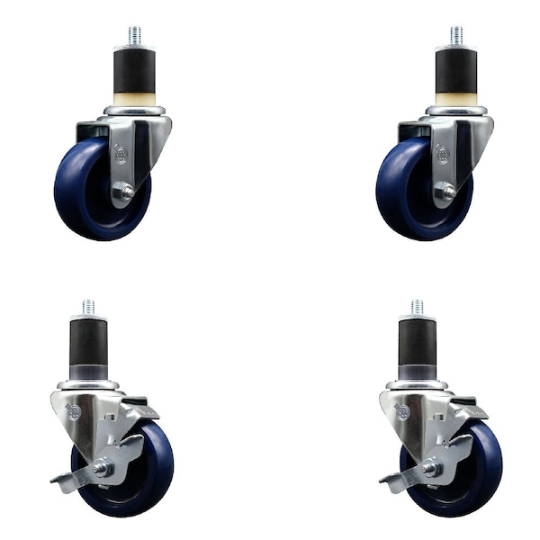 Listing is for a set of four 4 Service Caster Series #20 1-7/8'' expanding stem swivel casters, two 2 with top locking brakes, with 3-1/2'' diameter by 1-1/4'' wide blue solid polyurethane wheels capable of supporting a total weight of 1,200 lbs. 300 lbs./caster. When searching for a reliable and durable solution to your caster needs, look no further than the Service Caster Series 20 expanding stem solid polyurethane wheel casters. The Series #20 features an innovative expanding stem that can easily adapt to the inside diameter of the opening, allowing for a secure fit in round or square tubes. Simply tighten the topmost knurled nut to compress the rubber for a snug fit. For added security, further compress the rubber with a wrench via the nut under the swivel raceway. Finely crafted with a bright zinc plated finish, heat-treated ball bearing raceway, and a solid polyurethane wheel, this versatile caster is ideal for work tables, shop projects, or any equipment with round or square tube legs. Service Caster is unsurpassed in quality, reliability, and excellent customer service. Count on us to move you forward.