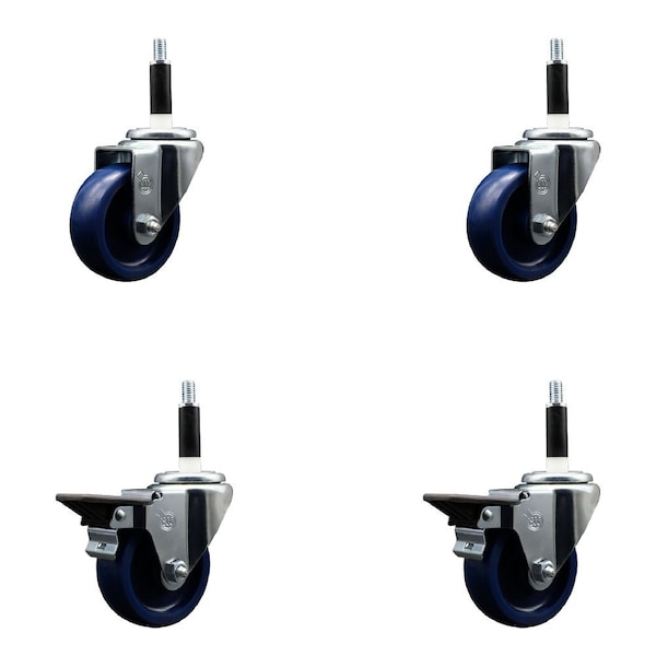 Listing is for a set of four 4 Service Caster Series #20 7/8'' expanding stem swivel casters, two 2 with posi locking brakes, with 3-1/2'' diameter by 1-1/4'' wide blue solid polyurethane wheels capable of supporting a total weight of 1,200 lbs. 300 lbs./caster. When searching for a reliable and durable solution to your caster needs, look no further than the Service Caster Series 20 expanding stem solid polyurethane wheel casters. The Series #20 features an innovative expanding stem that can easily adapt to the inside diameter of the opening, allowing for a secure fit in round or square tubes. Simply tighten the topmost knurled nut to compress the rubber for a snug fit. For added security, further compress the rubber with a wrench via the nut under the swivel raceway. Finely crafted with a bright zinc plated finish, heat-treated ball bearing raceway, and a solid polyurethane wheel, this versatile caster is ideal for work tables, shop projects, or any equipment with round or square tube legs. Service Caster is unsurpassed in quality, reliability, and excellent customer service. Count on us to move you forward.