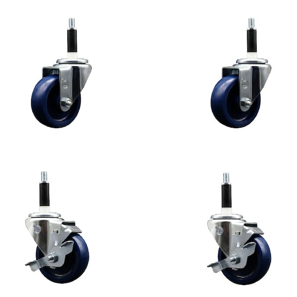 Listing is for a set of four 4 Service Caster Series #20 7/8'' expanding stem swivel casters, two 2 with top locking brakes, with 3-1/2'' diameter by 1-1/4'' wide blue solid polyurethane wheels capable of supporting a total weight of 1,200 lbs. 300 lbs./caster. When searching for a reliable and durable solution to your caster needs, look no further than the Service Caster Series 20 expanding stem solid polyurethane wheel casters. The Series #20 features an innovative expanding stem that can easily adapt to the inside diameter of the opening, allowing for a secure fit in round or square tubes. Simply tighten the topmost knurled nut to compress the rubber for a snug fit. For added security, further compress the rubber with a wrench via the nut under the swivel raceway. Finely crafted with a bright zinc plated finish, heat-treated ball bearing raceway, and a solid polyurethane wheel, this versatile caster is ideal for work tables, shop projects, or any equipment with round or square tube legs. Service Caster is unsurpassed in quality, reliability, and excellent customer service. Count on us to move you forward.