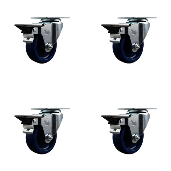 Listing is for a set of four 4 Service Caster Series #20 swivel casters, four 4 swivel casters with posi lock brakes, 3-1/2'' diameter by 1-1/4'' wide solid polyurethane wheel. Supports a total weight of 1,200lbs 300lbs/per caster. The Service Caster Series #20 is ideal for light and medium duty material handling, carts, equipment, and shop projects. The zinc plated finish provides durability under any condition. And the non-marking, non-marring polyurethane wheel is molded as one solid piece, making it free from debonding. This ensures the wheel will not flat spot, as can occur with comparable polyurethane wheels, resulting in a smooth and solid roll over long periods of time. Mounting options include top plate, bolt hole and standard and metric threaded stem sizes. Service Caster is unsurpassed in quality, reliability, and excellent customer service. Count on us to move you forward.