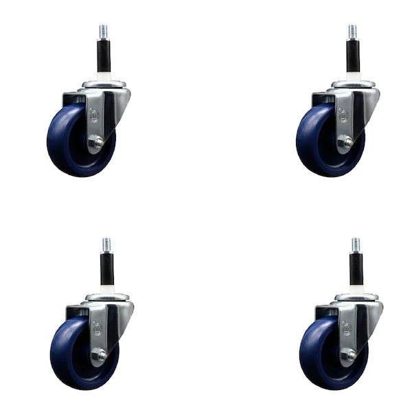 Listing is for a set of four 4 Service Caster Series #20 7/8'' expanding stem stainless steel swivel casters with 3-1/2'' diameter by 1-1/4'' wide blue solid polyurethane wheels capable of supporting a total weight of 1,200 lbs. 300 lbs./caster.. When searching for a reliable and durable solution to your caster needs, look no further than the Service Caster Series 20 expanding stem solid polyurethane wheel casters. The Series #20 features an innovative expanding stem that can easily adapt to the inside diameter of the opening, allowing for a secure fit in round or square tubes. Simply tighten the topmost knurled nut to compress the rubber for a snug fit. For added security, further compress the rubber with a wrench via the nut under the swivel raceway. Finely crafted with a bright zinc plated finish, heat-treated ball bearing raceway, and a solid polyurethane wheel, this versatile caster is ideal for work tables, shop projects, or any equipment with round or square tube legs. Service Caster is unsurpassed in quality, reliability, and excellent customer service. Count on us to move you forward.