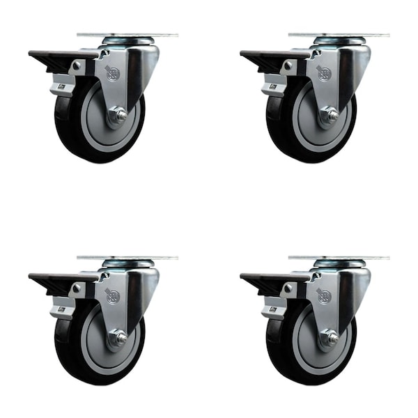4'' Black Poly Wheel Swivel Top Plate Caster Set Posi Brake, 4PK