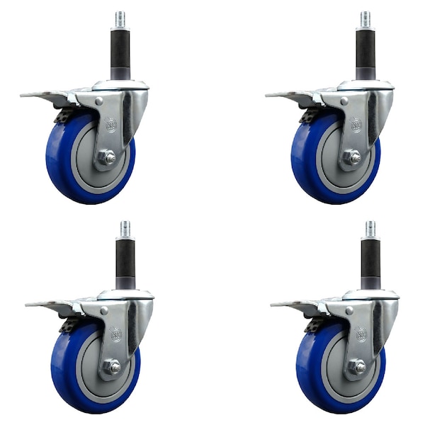 4'' Blue Poly Swivel 1'' Expanding Stem Caster Set Total Lock Brake, 4PK