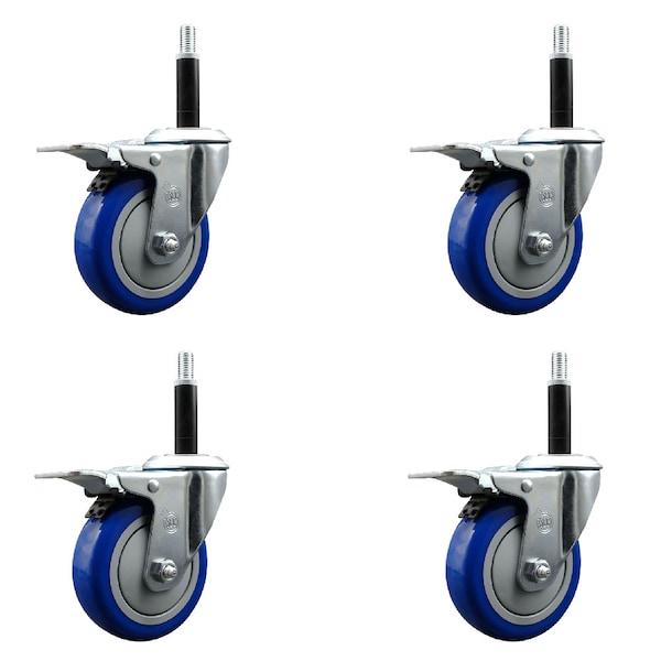 4'' Blue Poly Swivel 3/4'' Expanding Stem Caster Set Total Lock Brake, 4PK
