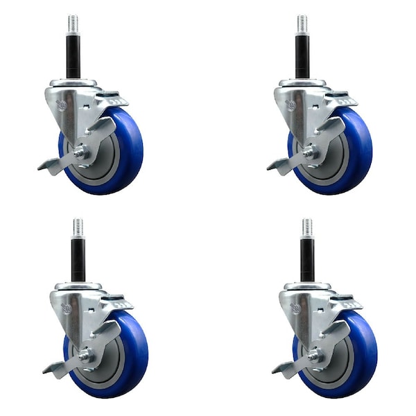 4'' Blue Poly Swivel 3/4'' Expanding Stem Caster Set with Brake, 4PK