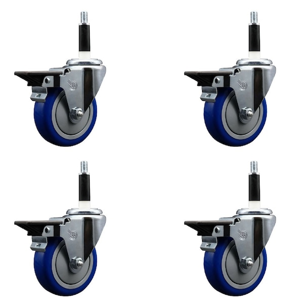 4'' Blue Poly Swivel 7/8'' Expanding Stem Caster Set with Brake, 4PK