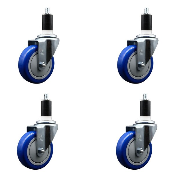 Listing is for a set of four 4 Service Caster Series #20 1-3/8'' expanding stem swivel casters with 4'' diameter by 1-1/4'' wide blue polyurethane wheels capable of supporting a total weight of 1,400 lbs. 350 lbs./caster.. When searching for a reliable and durable solution to your caster needs, look no further than the Service Caster Series 20 expanding stem blue polyurethane wheel casters. The Series #20 features an innovative expanding stem that can easily adapt to the inside diameter of the opening, allowing for a secure fit in round or square tubes. Simply tighten the topmost knurled nut to compress the rubber for a snug fit. For added security, further compress the rubber with a wrench via the nut under the swivel raceway. Finely crafted with a bright zinc plated finish, heat-treated ball bearing raceway, and a blue polyurethane wheel, this versatile caster is ideal for work tables, shop projects, or any equipment with round or square tube legs. Service Caster is unsurpassed in quality, reliability, and excellent customer service. Count on us to move you forward.